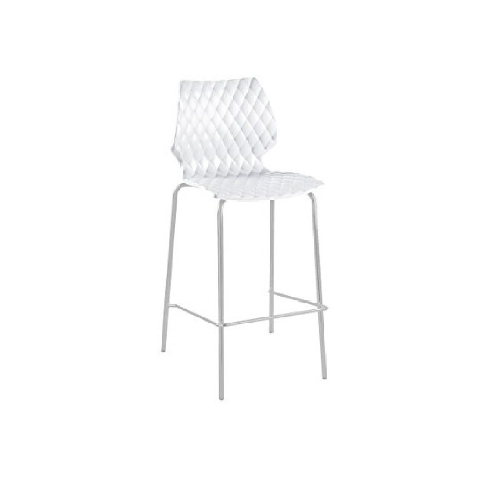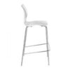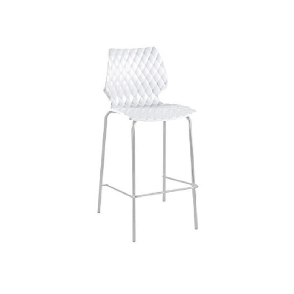Elegant white design bar stool with backrest and PVC seat. Perfect for stylish events and cocktail areas. Also available in blue on request.